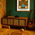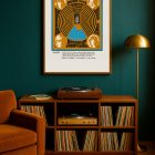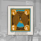 Desenhado por Solinsky, o pôster captura perfeitamente a essência hipnótica e surreal daquele período. O design circular no centro dá aquela sensação de “viagem” psicodélica, como se estivesse te puxando para um túnel em direção ao coração da música do The Doors. E não dá pra ignorar os retratos de todos os membros da banda espalhados pelos cantos, com Morrison em destaque, claro – o Rei Lagarto sempre presente, te encarando e te desafiando a “break on through to the other side.”