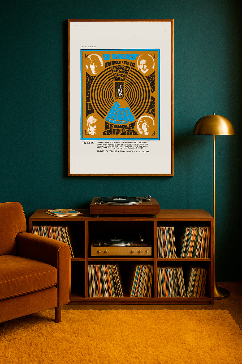 A arte usa cores vibrantes em tons de azul e dourado, criando um contraste visual que certamente chamava a atenção dos jovens contraculturais da época. E olha só o detalhe: o show ainda foi promovido pela Del-Bar Productions, uma produtora de eventos locais que ajudou a impulsionar o rock psicodélico em Berkeley.